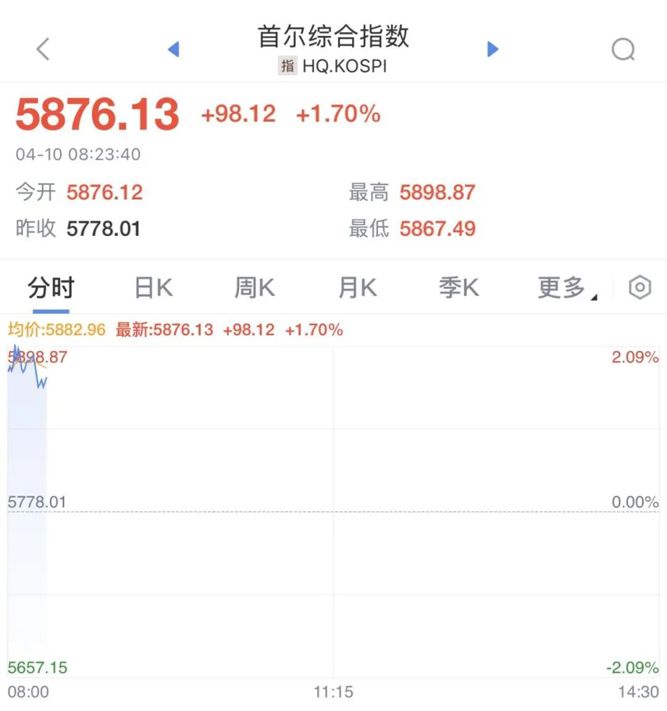 4月10日,日韩股市集体高开,韩国KOSPI指数一度涨逾2%,最新报5876.13点。