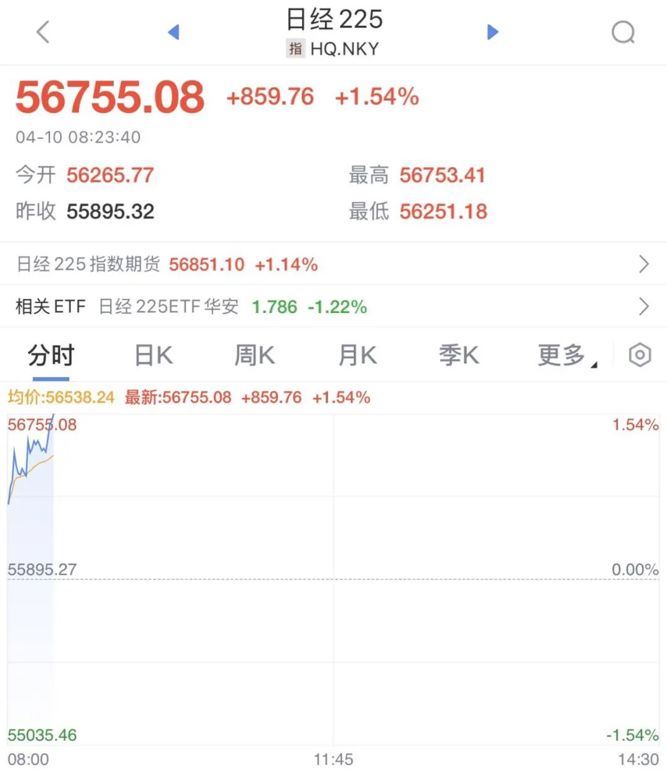 日本股市震荡拉升,日经225指数现涨1.54%,报56755.08点。
