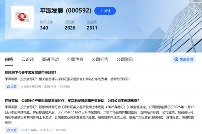 12月19日,平潭发展在深交所互动易上回复投资者提问称,二级市场股票价格受国际、国内经济形势、公司业绩、投资者认可情况等诸多因素共同影响上下波动,公司主营业务未发生重大变化,股价短期内连续上涨,敬请广大投资者注意风险,理性投资。