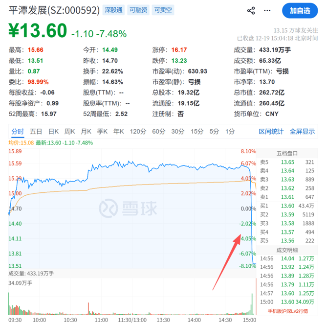 事情是这样的:12月19日,作为两岸融合概念股,平潭发展高开高走,盘中涨势良好。但临近尾盘,平潭发展忽然上演“高台大跳水”,从涨约6%迅速跌超8%,当日振幅超14%。截至收盘,平潭发展报13.6元/股,跌幅为7.48%。