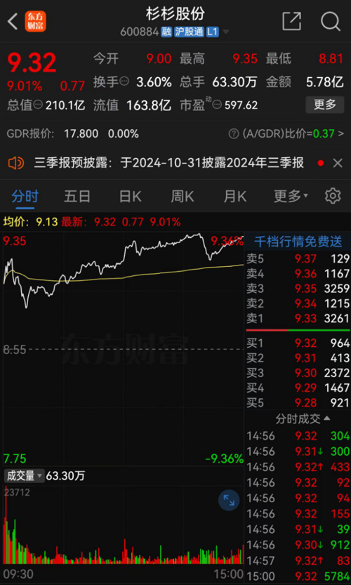 截至9月30日收盘,杉杉股份的总市值为210.1亿元。