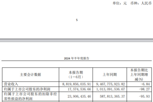首先,杉杉股份专注于锂电池负极材料和偏光片业务的发展,2024年上半年的营业收入为88.20亿元,同比下降6.84%;归母净利润为1757.45万元,同比下降98.27%。