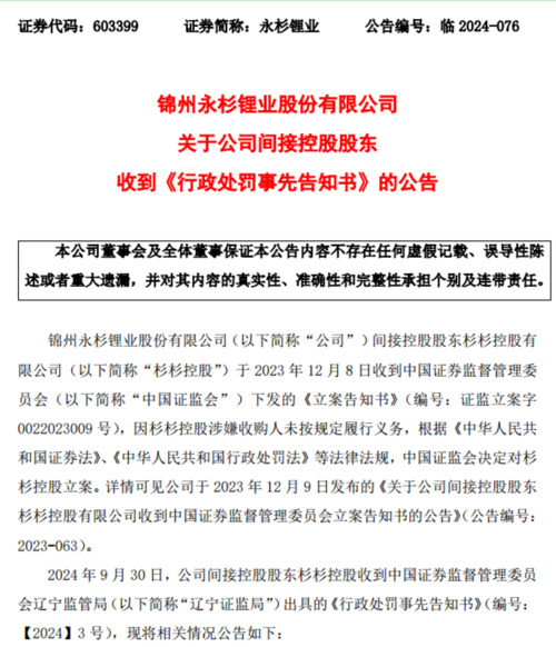 9月30日,杉杉控股收到辽宁证监局下发的《行政处罚事先告知书》显示,杉杉控股持有永杉锂业(彼时证券简称吉翔股份)已发行的有表决权股份超过30%,但在继续进行收购时未履行要约义务。