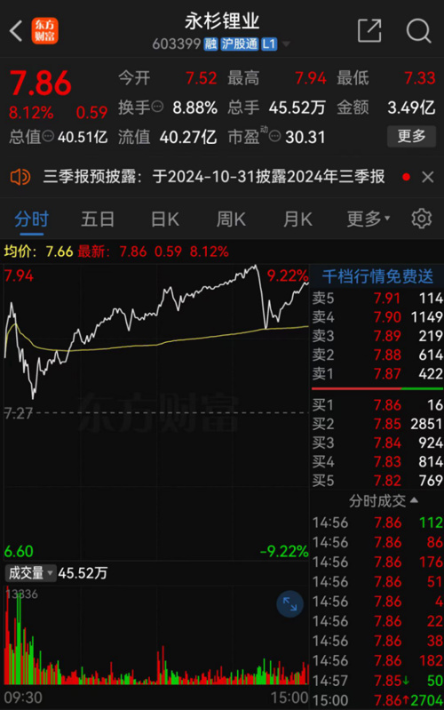 截至9月30日收盘,永杉锂业的总市值为40.51亿元。