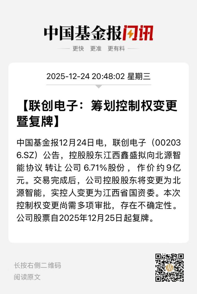 12月24日,联创电子公告称,公司控股股东江西鑫盛与北源智能签订了《股份转让协议》,约定北源智能分批支付9亿元,收购江西鑫盛持有的联创电子无限售流通股7086.61万股,占上市公司股份总数的6.71%。
