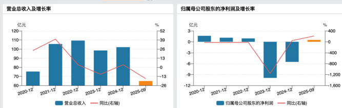 业绩方面,2025年前三季度,公司实现营业总收入64.89亿元,同比下降16.20%;归母净利润为5092.02万元,同比扭亏。