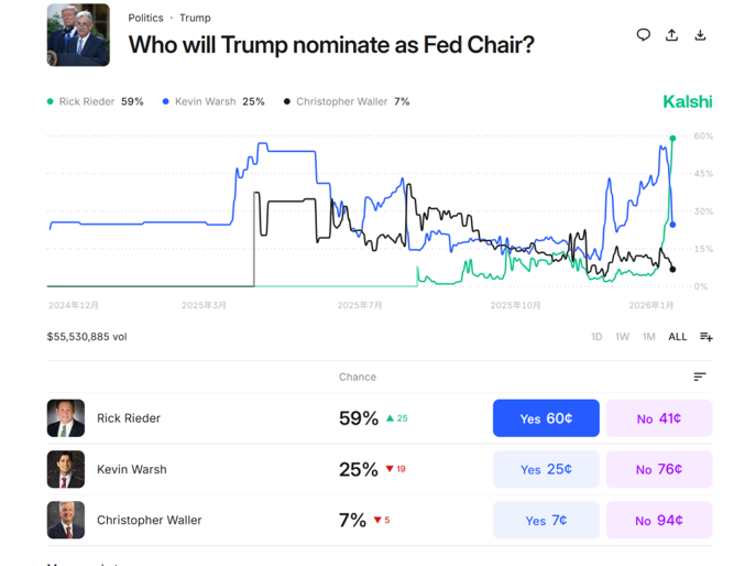 这位资产管理巨头的固定收益首席投资官,已从前美联储理事凯文·沃什手中夺回第一位置。根据预测市场平台Kalshi上的交易员数据,里德尔被提名担任该职位的概率约为60%,而沃什为25%。
