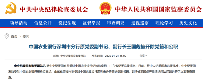 1月21日,中央纪委国家监委官网通报:中国农业银行深圳市分行原党委副书记、副行长王国彪被开除党籍和公职。