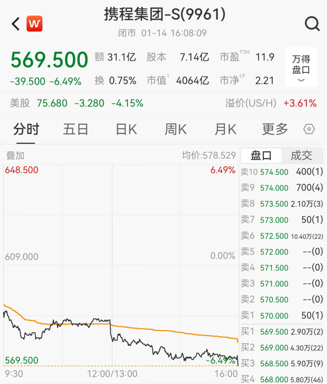 二级市场方面,截至港股收盘,携程集团跌6.49%,报569.5港元/股。