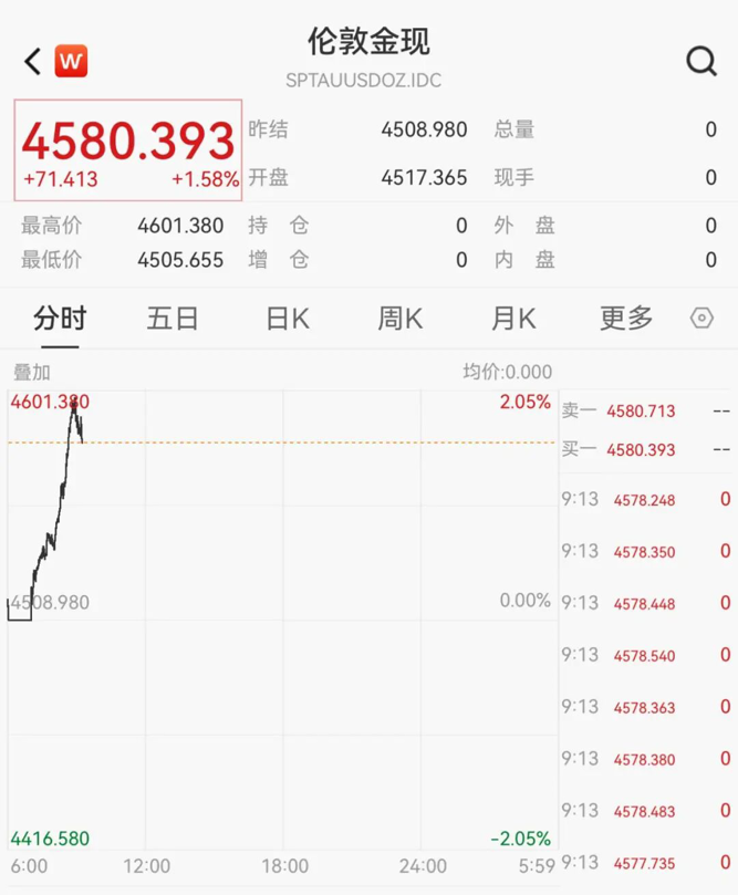 截至发稿,现货黄金报4580.393美元/盎司,日内涨1.58%。