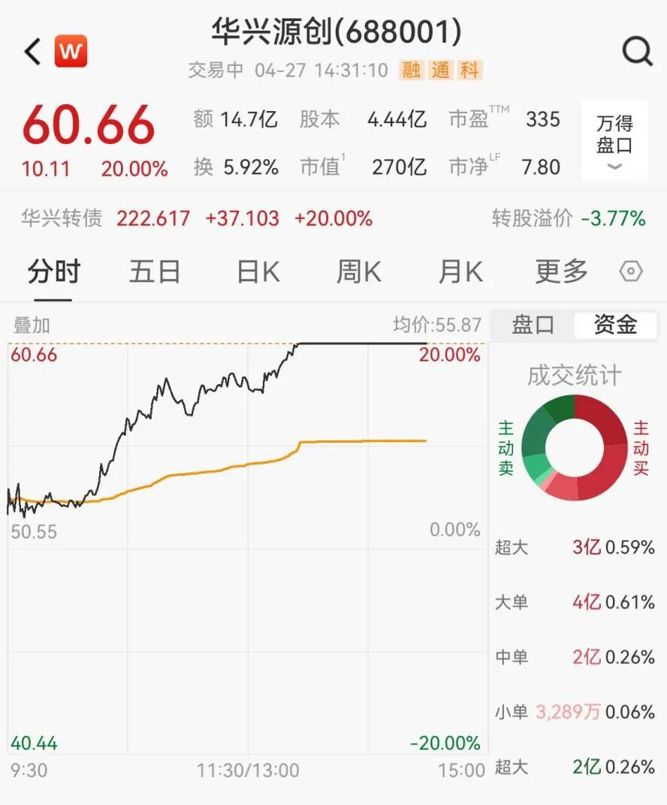 4月27日盘中,科创板第一股华兴源创大涨20cm触及涨停,现报60.66元/股,对应总市值为270亿元。