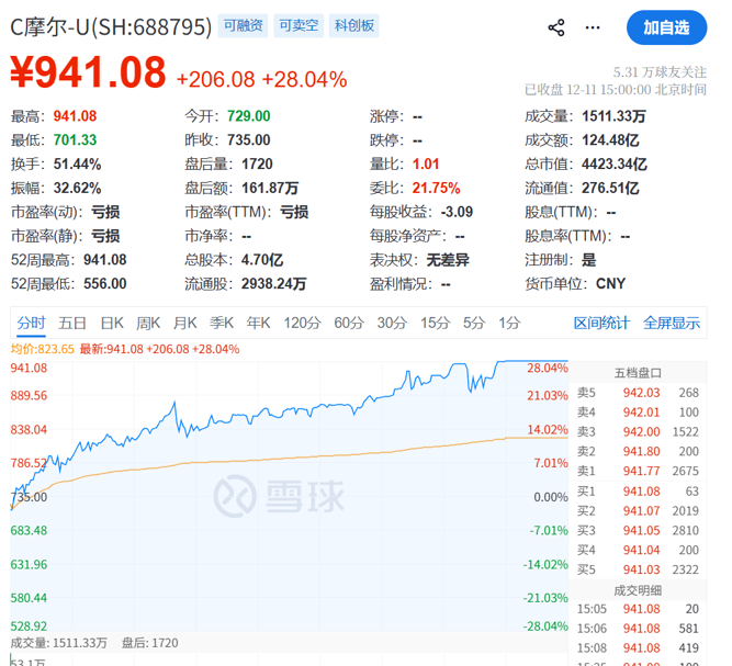 当你们还在为一次小幅反弹或守住阵地而庆幸时,请抬头看一看我们的走势。摩尔线程的股价,已突破九百元,市值站上四千二百亿元。单日超过20%的涨幅,上百亿元的资金在我们这里汇聚、奔涌,这不是普通的上涨,这是一场无可阻挡的技术风暴与资本共识。