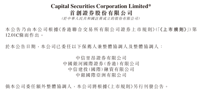 此次赴港上市,首创证券委任以下保荐人兼整体协调人及整体协调人:中信里昂证券有限公司、中国银河国际证券(香港)有限公司、中信建投(国际)融资有限公司、中银国际亚洲有限公司。