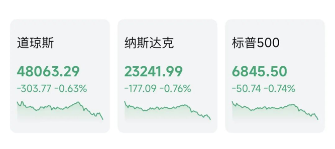 截至收盘,道指跌0.63%,报48063.29点;标普500指数跌0.74%,报6845.5点;纳指跌0.76%,报23241.99点,均录得四连跌。拉长时间来看,2025年全年,道指涨12.97%,标普500指数涨16.39%,纳指涨20.36%,均录得年线三连涨。