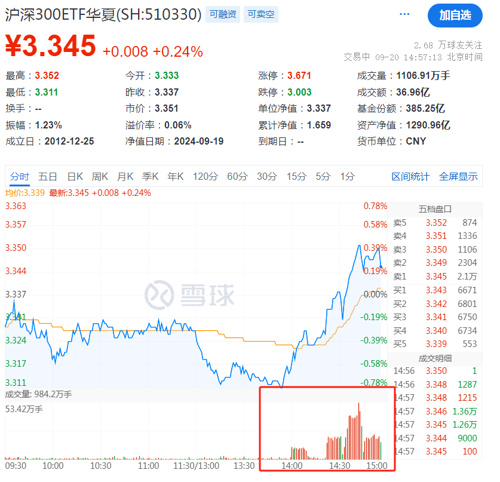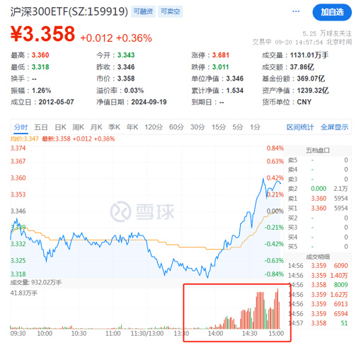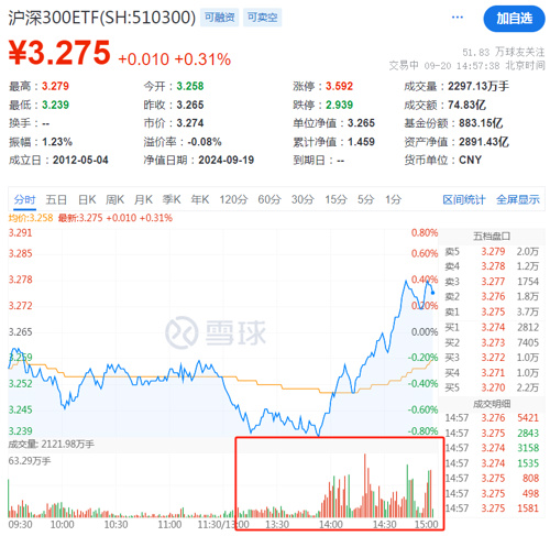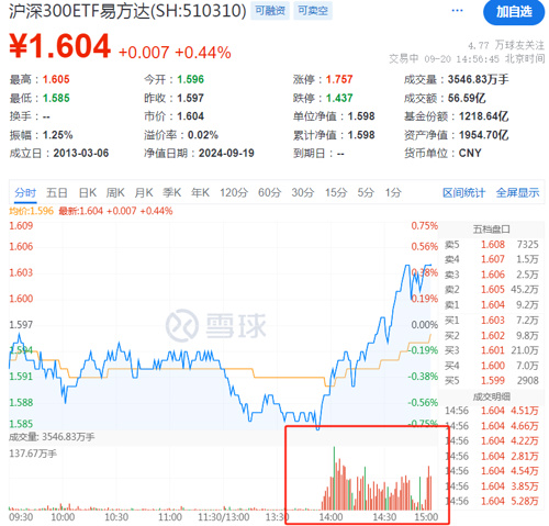 最后临近尾盘,四只沪深300ETF尾盘持续放量并全线翻红,易方达沪深300ETF(510310)、华夏沪深300ETF(510330)分别成交超50亿和30亿元,另外华泰柏瑞沪深300ETF(510300)、嘉实沪深300ETF(159919)亦超过昨日成交。