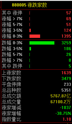 两市共1639只个股上涨,57只个股涨停,3259只个股下跌。
