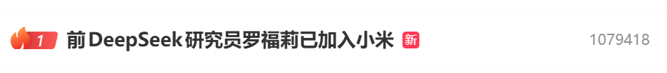 随后,#前DeepSeek研究员罗福莉已加入小米#的词条登上微博热搜榜首位,且关注度持续提升。