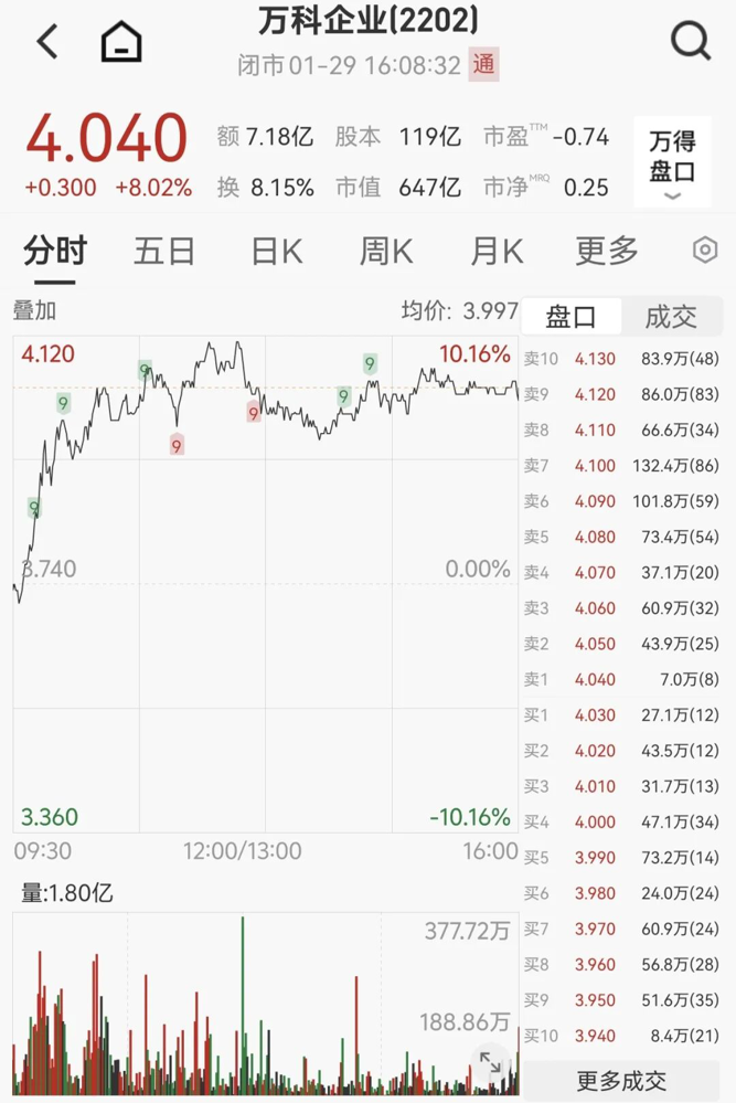 万科企业早盘直线拉升,最高涨幅达10.16%,全天收于4.04港元,涨8.02%。