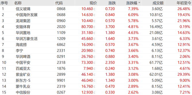 恒生指数成份股中54只上涨,29只下跌。其中,信义玻璃涨7.39%,中国海外发展涨6.09%,龙湖集团涨5.78%。