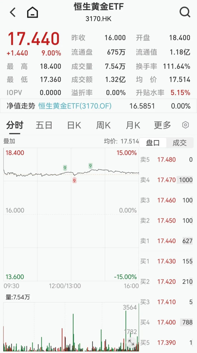 1月29日,恒生投资管理有限公司(以下简称恒生投资)推出的恒生黄金ETF在香港交易所上市,为香港首只可于银行兑换实物黄金的ETF。上市首日,该ETF大幅高开,大涨15%;全天收于17.44港元,涨9%,升贴水率高达5.15%。