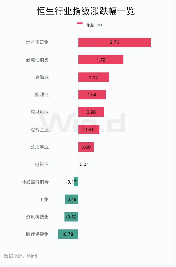香港恒生行业指数中,地产建筑业指数涨2.75%,必需性消费行业指数涨1.72%,金融业指数涨1.17%;跌幅方面,医疗保健业指数跌0.78%,资讯科技业指数跌0.52%。
