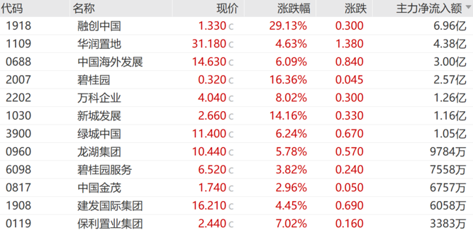 资金大量流入内房股并推高股价。融创中国主力净流入额达6.96亿港元,大涨29.13%。此外,碧桂园涨16.36%,新城发展涨14.16%。