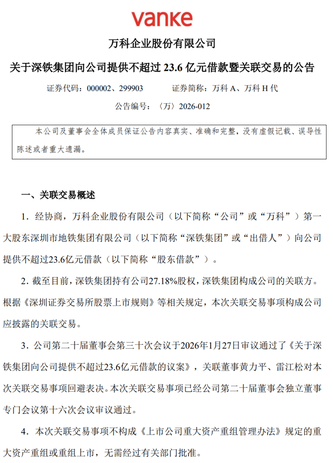 万科企业发布公告称,公司第一大股东深铁集团拟向公司提供不超过23.6亿元的股东借款,用于偿还公司在公开市场发行的债券本金与利息。该借款构成关联交易,已由公司董事会审议通过,关联董事回避表决,独立董事专门会议通过该议案。该事项不构成重大资产重组,无需额外审批。