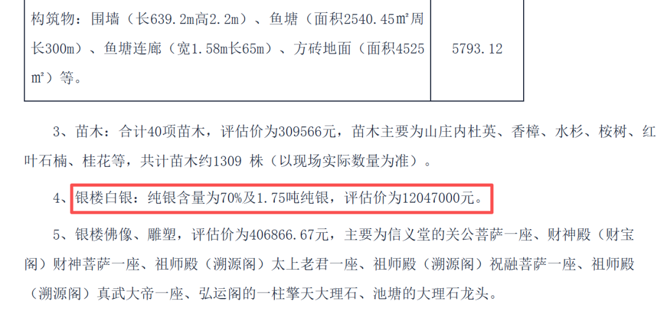 拍卖平台公告显示,标的物中,土地评估价为9181200元、地上建筑物评估价为9426556元、苗木评估价为309566元、银楼白银评估价为12047000元,此外,银楼佛像、雕塑,评估价为406866.67元。以上资产整体评估价为3137余万元,起拍价为25096950元。