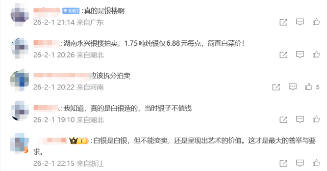 法拍平台信息显示,该楼纯银含量为70%,共用了1.75吨纯银;评估价值为12047000元,折算后单价相当于每克纯银6.88元。