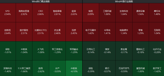 板块上来看,医药板块领涨市场,消费电子、半导体、通信设备等板块表现活跃;而航天军工、银行、化工等板块跌幅居前。