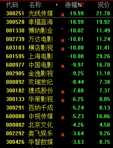 下跌方面,影视股集体大跌,光线传媒、中国电影等多股跌停。