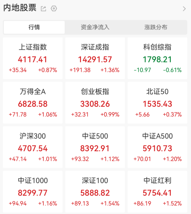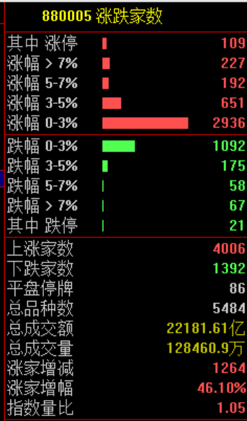 市场共4006只个股上涨,109只个股涨停,1392只个股下跌,21只个股跌停。