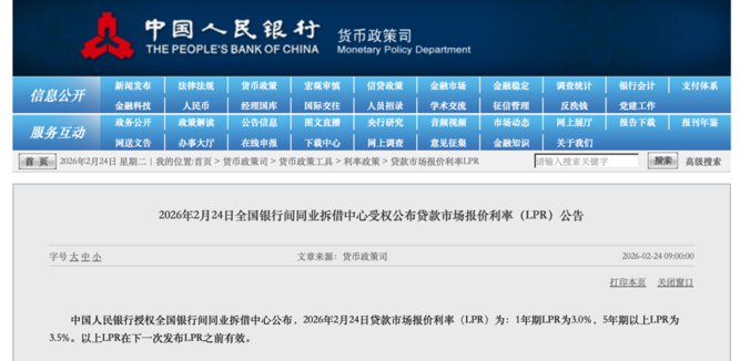 2月24日,中国人民银行授权全国银行间同业拆借中心公布,2026年2月24日贷款市场报价利率(LPR)为:1年期LPR为3.0%,5年期以上LPR为3.5%。以上LPR在下一次发布LPR之前有效。