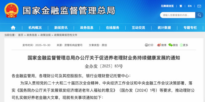 10月30日,国家金融监督管理总局办公厅对外发布关于促进养老理财业务持续健康发展的通知。