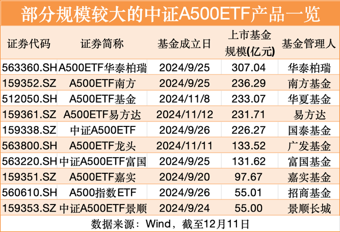作为新“国九条”发布后的首只宽基指数,中证A500指数相关产品吸引多家基金公司争相布局,截至12月11日,仅场内跟踪中证A500指数的ETF数量就已经达到45只之多,合计规模突破2000亿元。