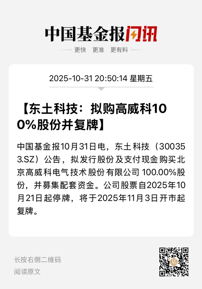 10月31日,东土科技宣布拟通过发行股份及支付现金的方式收购高威科100%股权,并募集配套资金。本次交易预计构成重大资产重组,公司股票将于11月3日复牌。