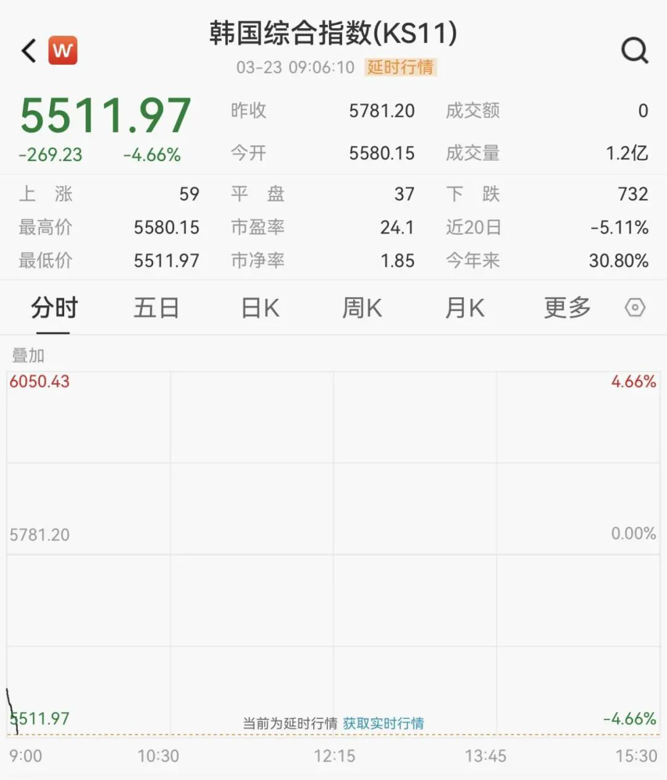 韩国市场大幅低开后持续下挫,韩国综合指数跌超4%,现报5511.97点。韩国交易所于KOSPI 200期货下跌5%后启动KOSPI指数熔断机制,程序化交易暂停5分钟。