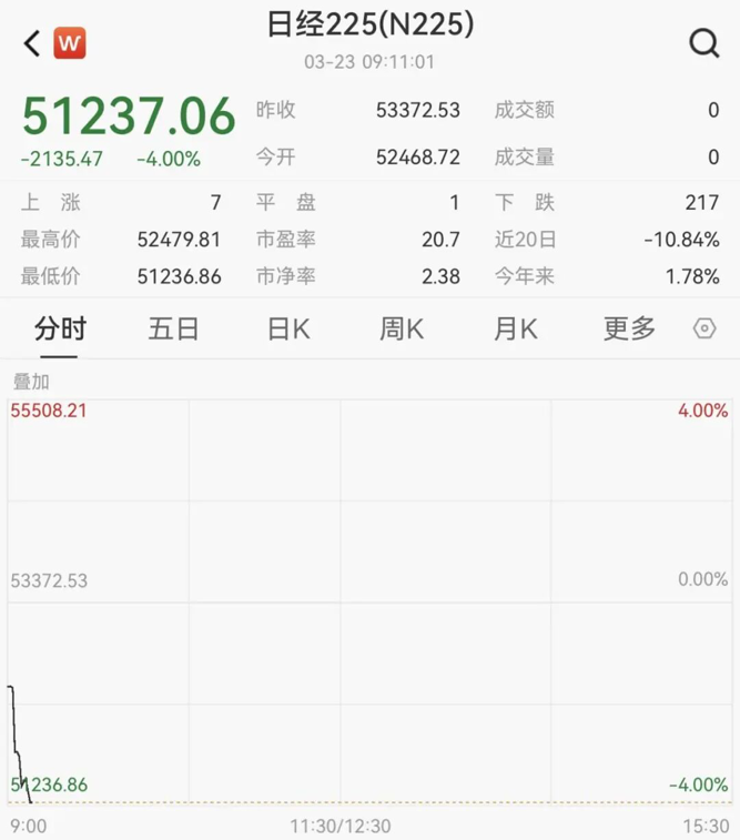 日本股市开盘跳水,日经225指数跌破52000点,日内跌幅扩大至4%。