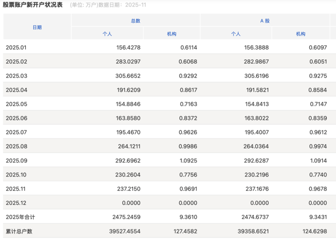 上交所披露的数据显示,2025年11月A股新开户238万户,较10月的231万户增长约3%,2025年前11个月累计新开2484万户,同比增长7.95%。