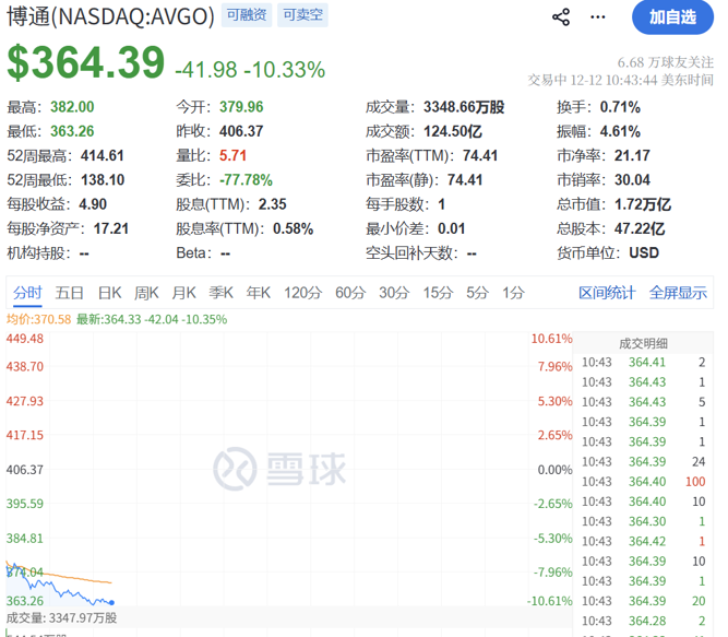 对人工智能热潮的担忧再度加剧,科技股承压。继甲骨文股价周四暴跌后,博通股价也成为关注焦点,跌幅约为10%。