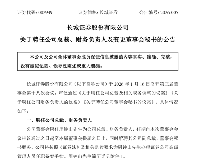 1月16日晚间,长城证券公告称,公司董事会正式聘任周钟山为公司总裁、财务负责人,同时聘任阮惠仙为董事会秘书。代行总裁职责六个月后,周钟山获正式任命。