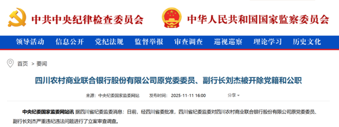 日前,经四川省委批准,四川省纪委监委对四川农村商业联合银行股份有限公司原党委委员、副行长刘杰严重违纪违法问题进行了立案审查调查。