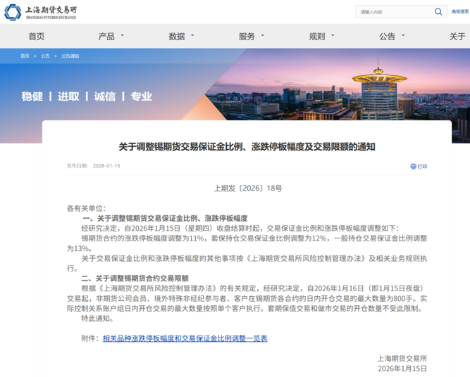 自2026年1月15日(星期四)收盘结算时起,交易保证金比例和涨跌停板幅度调整如下: