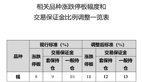 一是关于调整锡期货交易保证金比例、涨跌停板幅度。