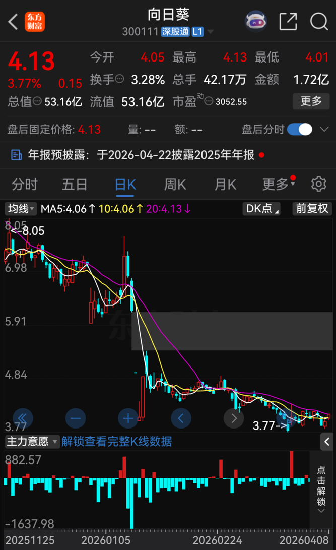截至4月8日,向日葵股价报4.13元/股,总市值为53.16亿元。