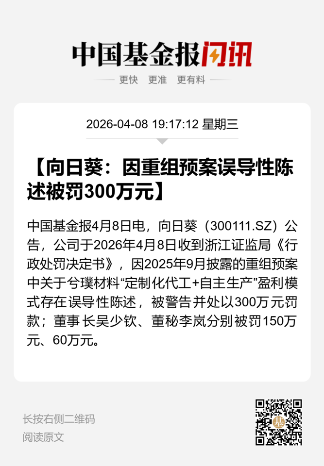 浙江证监局决定,对向日葵给予警告并处以300万元罚款;对向日葵董事长吴少钦、董事会秘书李岚给予警告,并分别处以150万元、60万元罚款。
