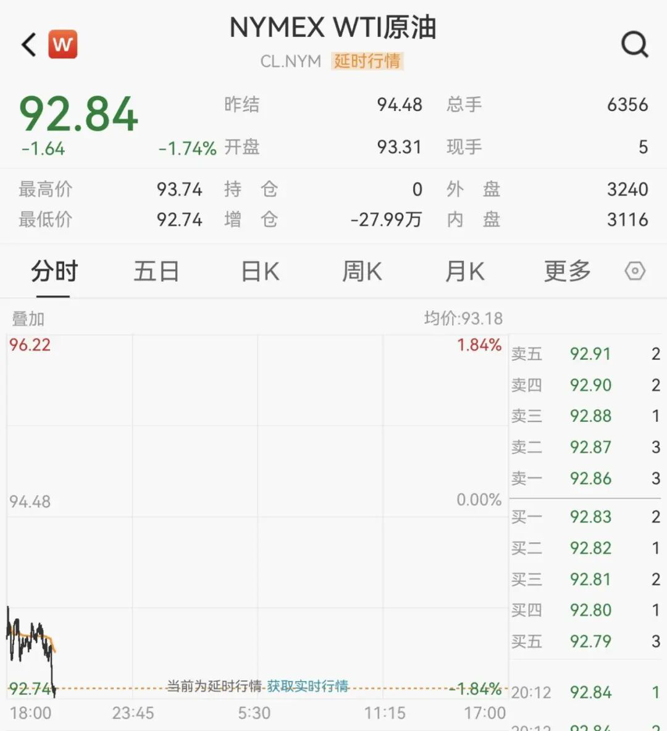 WTI原油失守93美元/桶,日内跌1.74%。