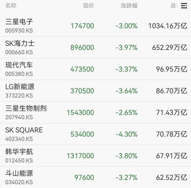 权重股方面,三星电子、SK海力士、现代汽车等均跌超3%。
