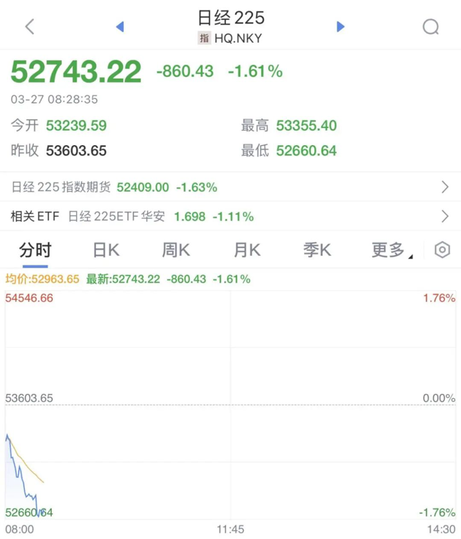 此外,日本股市低开低走,日经225指数跌超1%,至52743.22点。