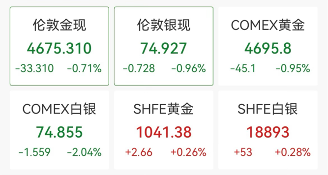 周一开盘,现货黄金跳空低开,现报4675.31美元/盎司,日内跌幅为0.71%;现货白银失守75美元/盎司,日内跌幅近1%。